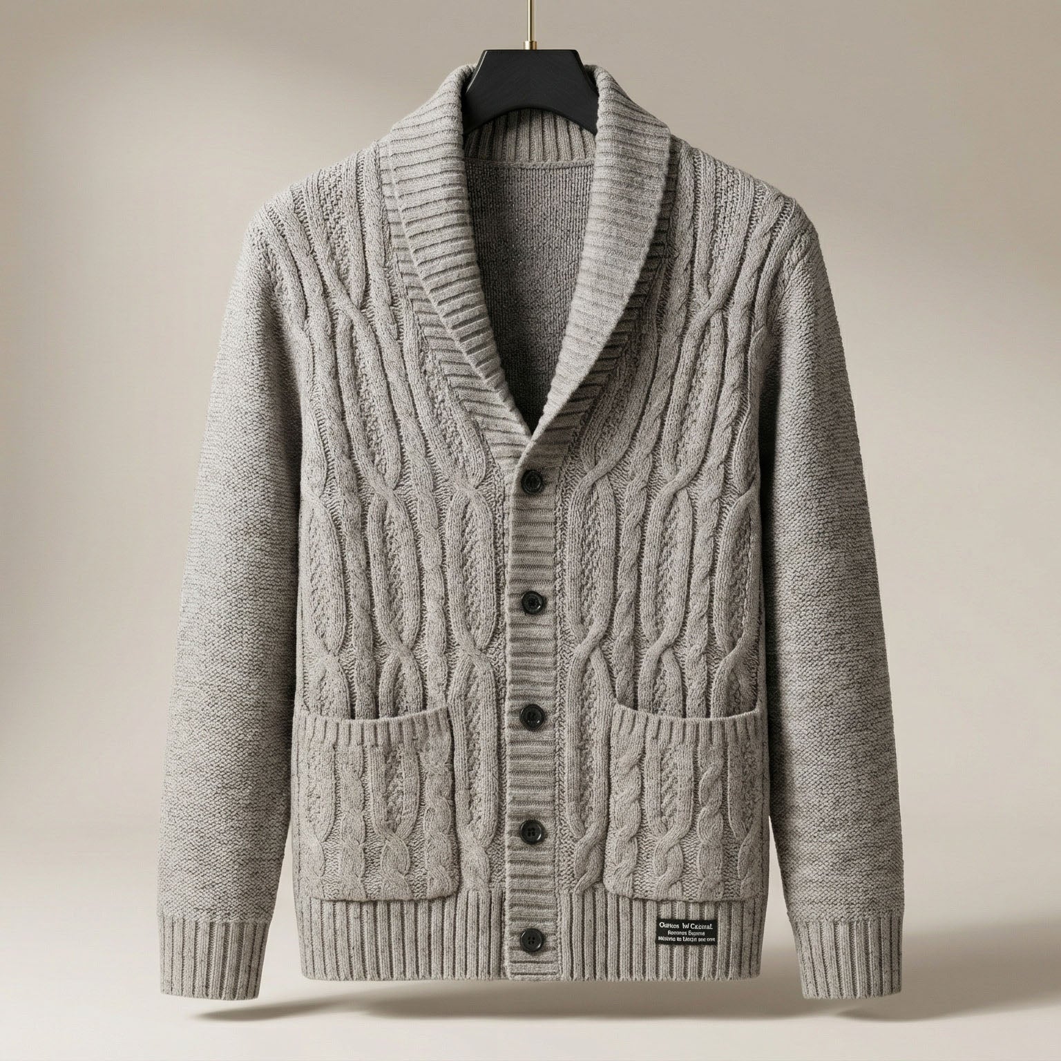 Crafted from a substantial cotton-blend knit, this cardigan offers a soft yet reassuring weight that feels warm, steady, and comfortable throughout the day. The shawl collar, button front, and calm grey tone create a quietly refined layer that keeps everyday dressing composed, mature, and effortlessly dependable.