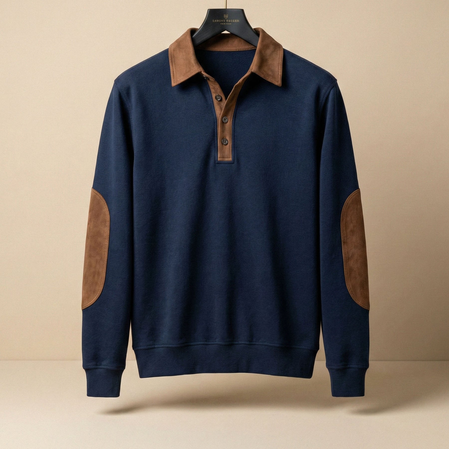 • Details: Button placket, contrast collar, elbow patches