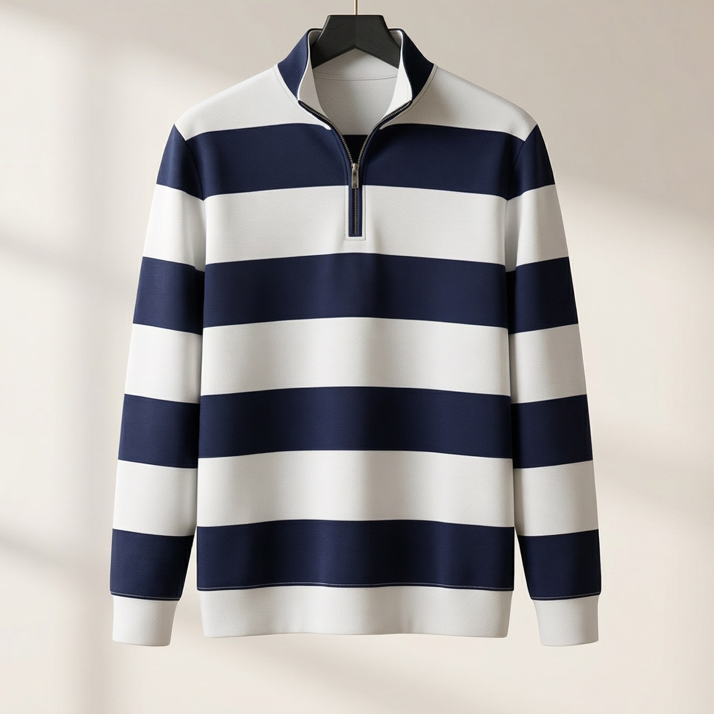 A medium-weight knit with a relaxed structure insulates the body while limiting wind penetration across the chest and arms. Soft cotton construction with a smooth interior surface and ribbed edges maintains comfort against the skin and holds shape through daily wear.