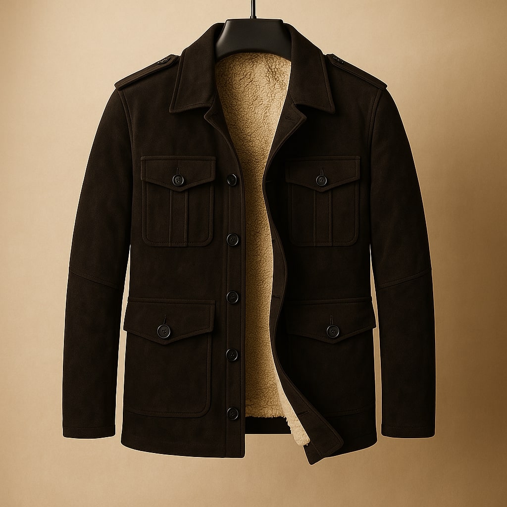 A sueded shell combined with a sherpa-style lining blocks cold and wind while avoiding the weight and bulk that make classic lined jackets cumbersome. The defined pocket layout and firm collar structure keep the silhouette controlled, preventing the puffed shape that limits ease of wear.