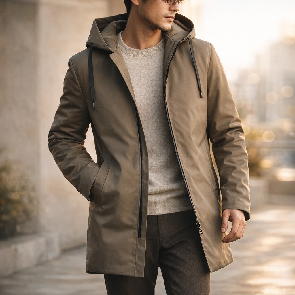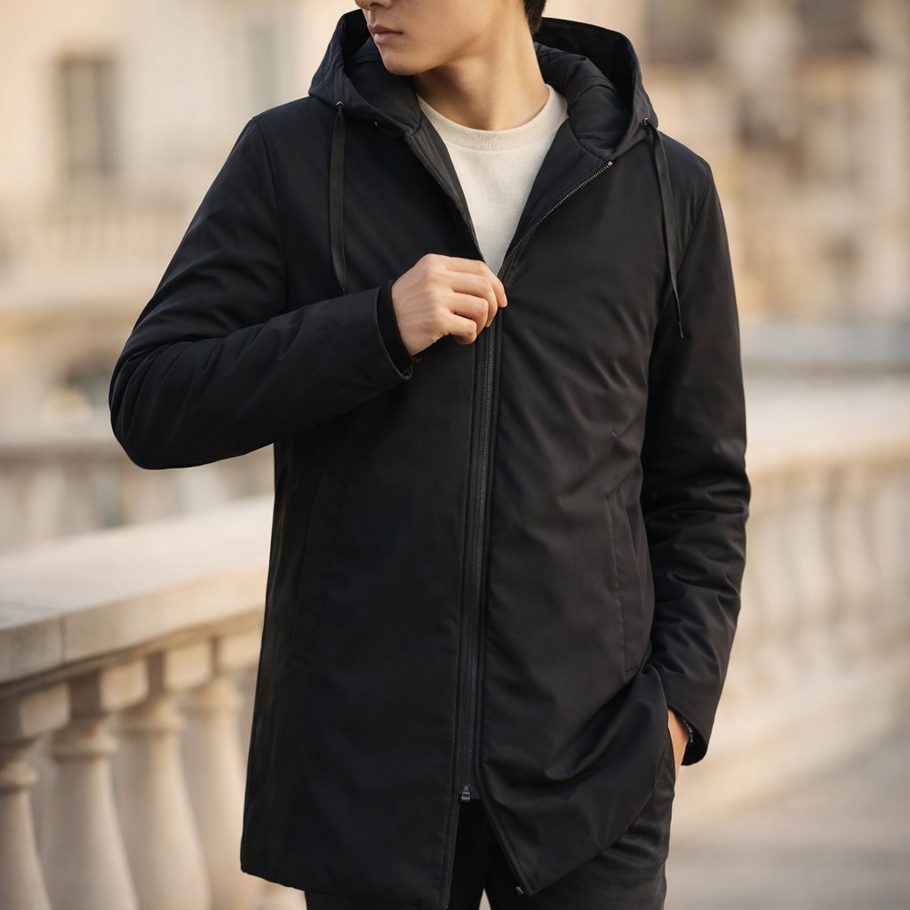 A streamlined hooded coat built to block cold air and maintain a confident outline through a close, structured cut and clean panel construction. The outer fabric is smooth and stable, paired with a full-length zip and integrated hood that preserve shape and visual clarity during wear.