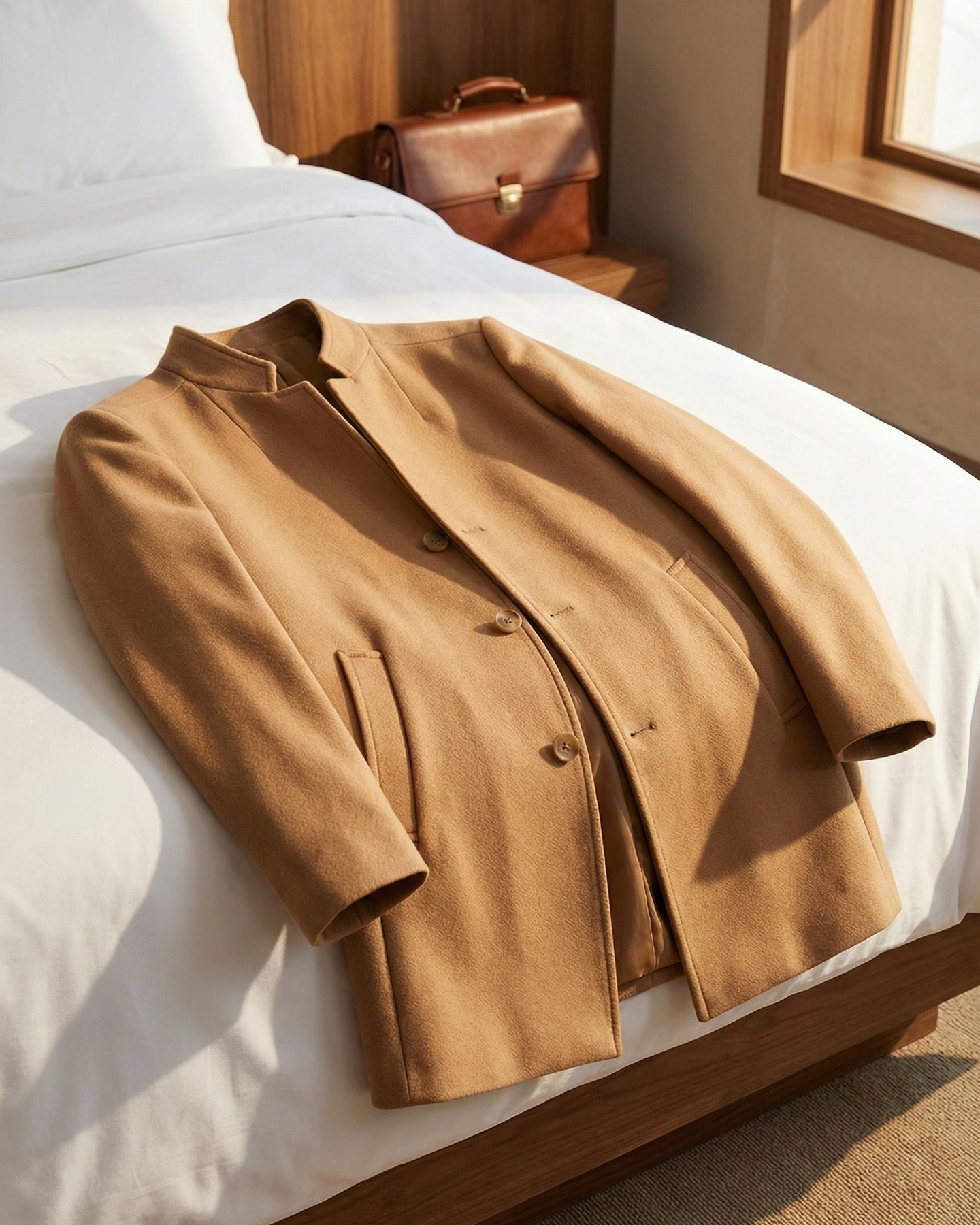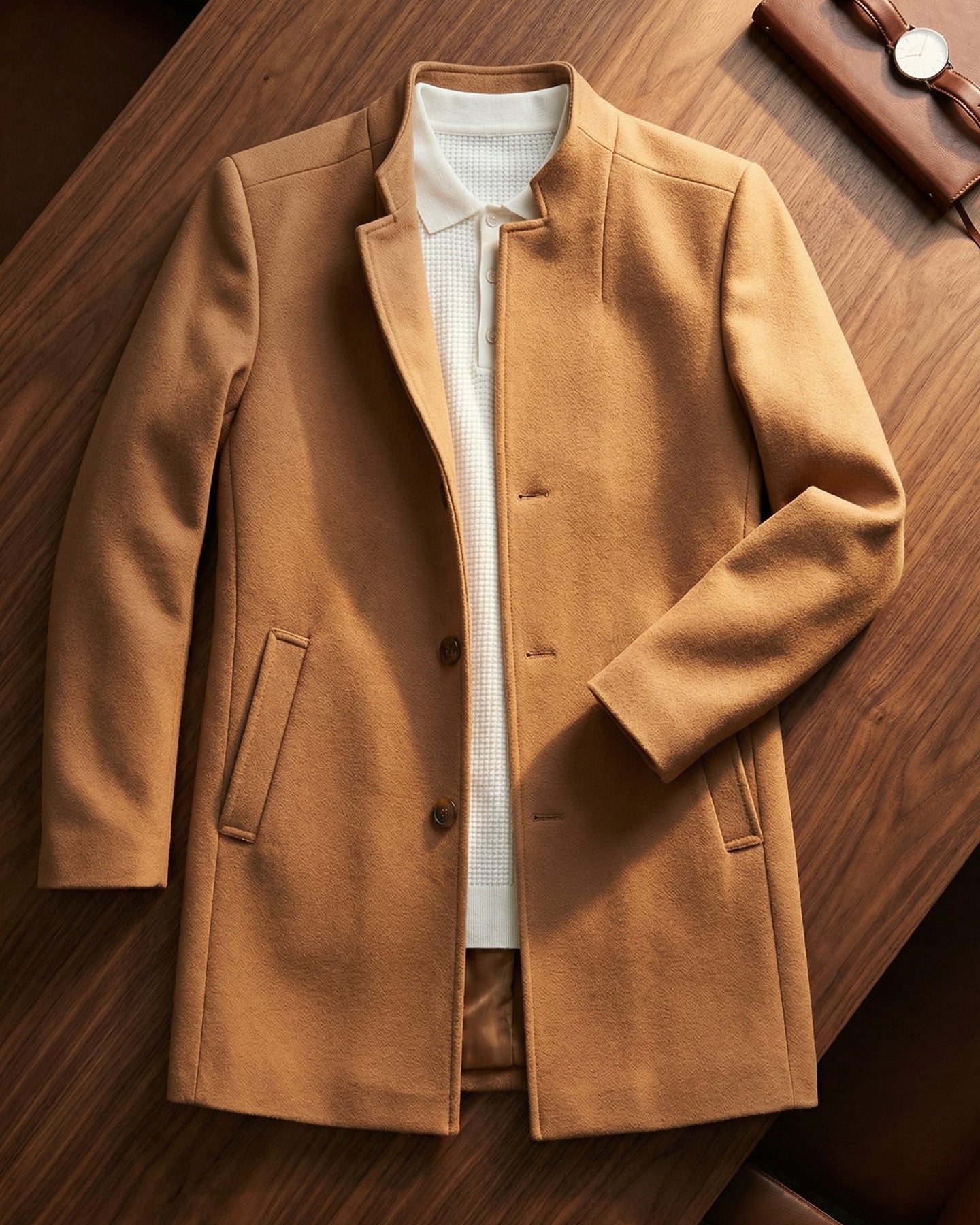 Crafted from a dense, soft-touch fabric with a smooth, brushed surface, it feels substantial yet comfortable, offering light warmth while maintaining a clean, structured drape. The collarless neckline, streamlined buttons, and minimal detailing create a refined silhouette suited for everyday wear, delivering quiet polish without formality.