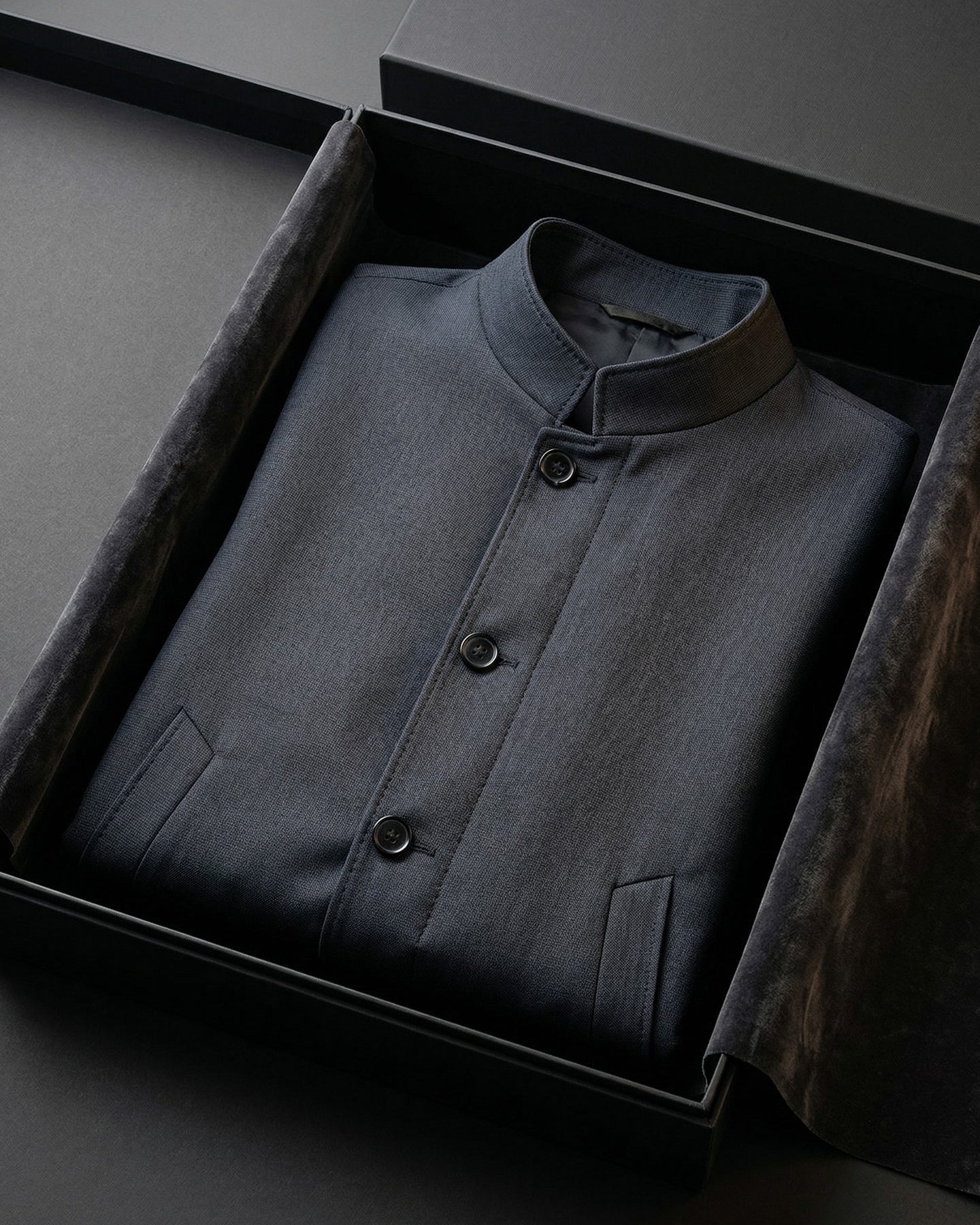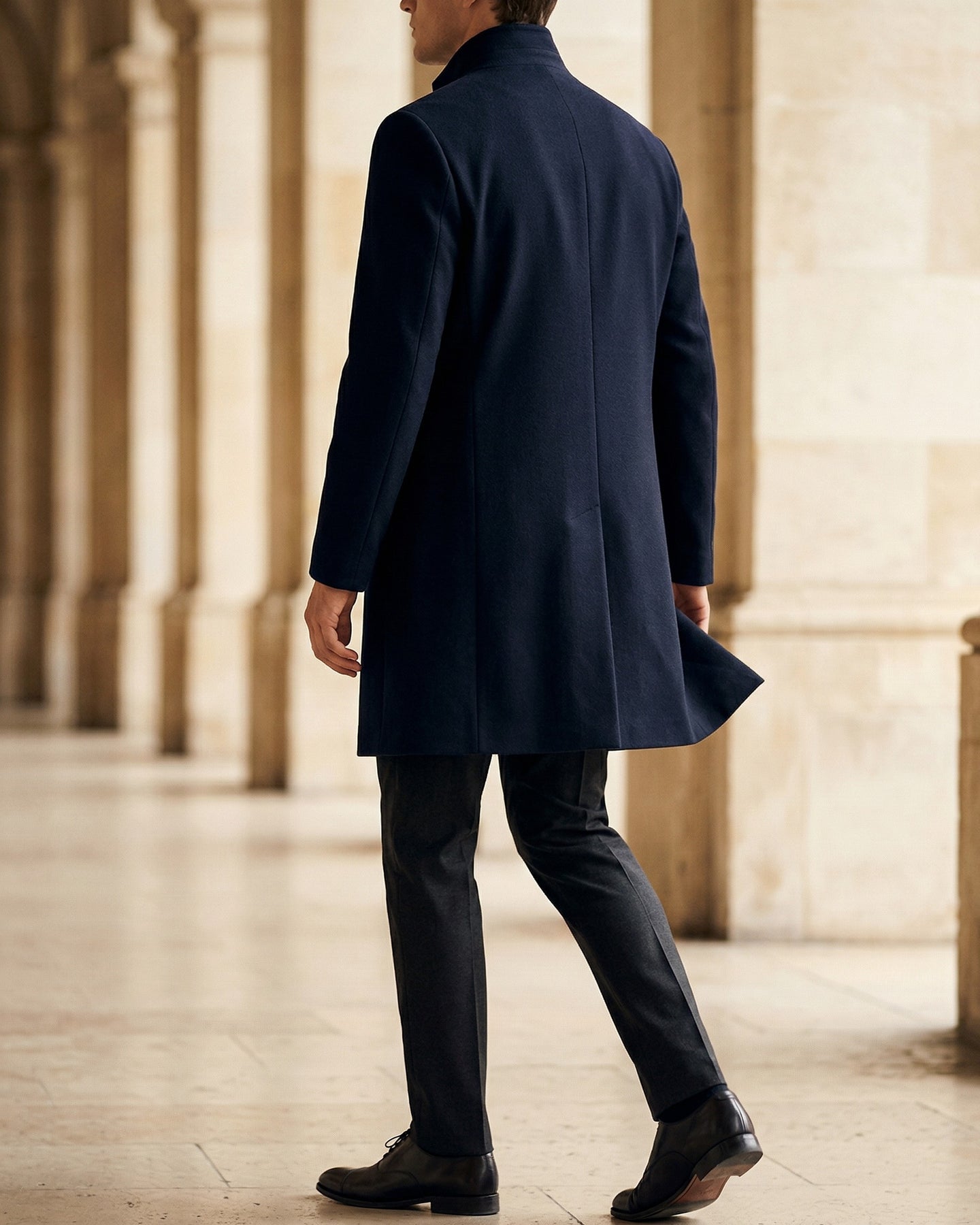 Dense, smooth-faced fabric with just enough structure to hold its shape on your shoulders. The stand collar closes your silhouette without a tie, a scarf, or a second thought, you simply put it on and you're done.