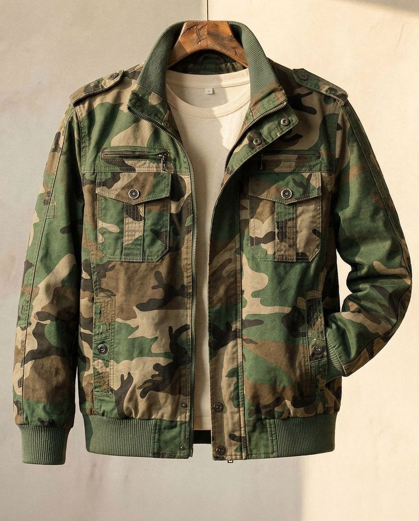 • Details — Structured collar, zip front, button accents, and chest flap pockets