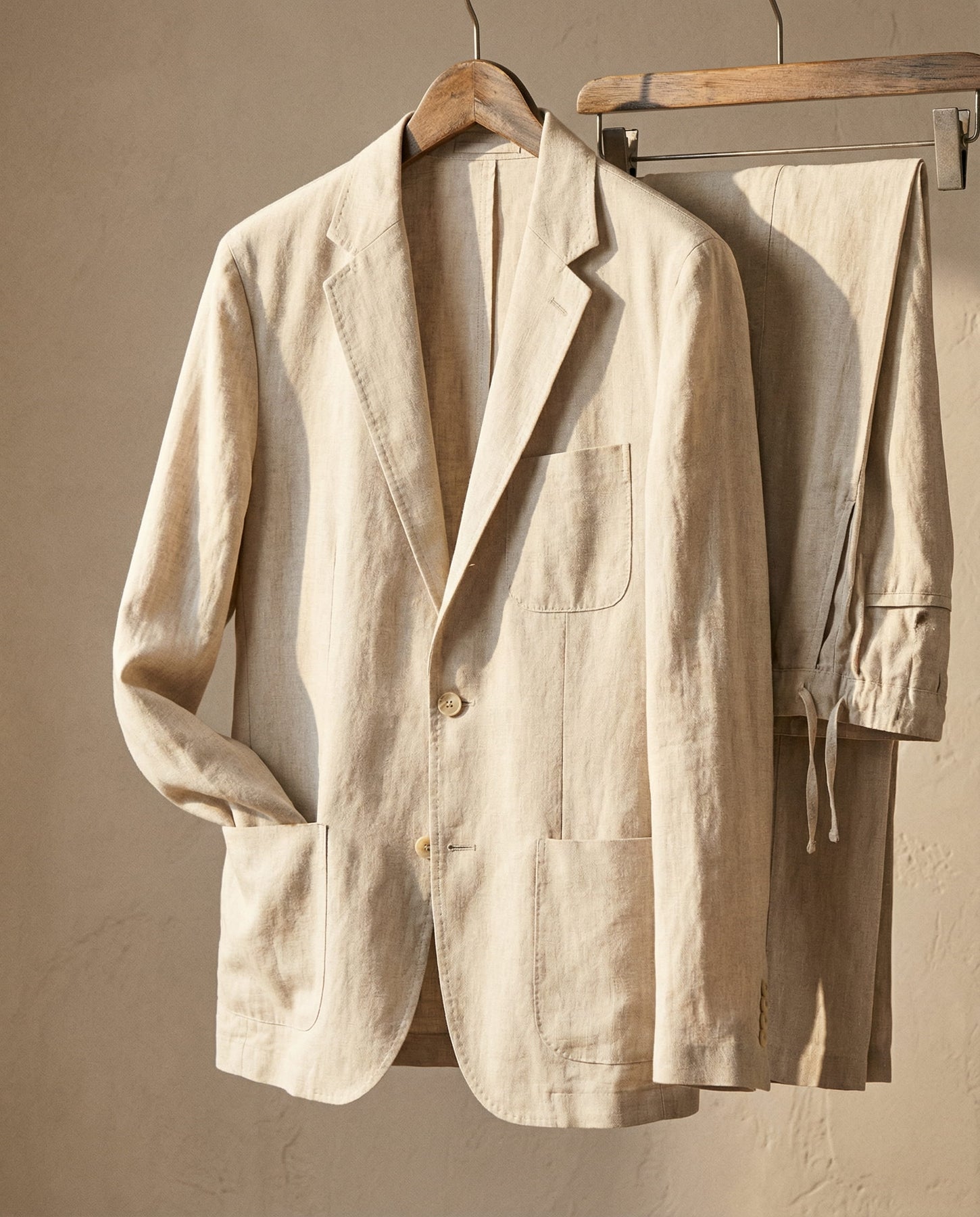 Crafted from a breathable linen-blend fabric, this suit offers a lightweight, airy feel with a soft drape that keeps you cool while maintaining a composed silhouette. Designed with relaxed tailoring, natural shoulders, and understated patch pockets in a timeless sand tone, it delivers effortless refinement for warm-weather occasions, professional settings, and travel with quiet authority.