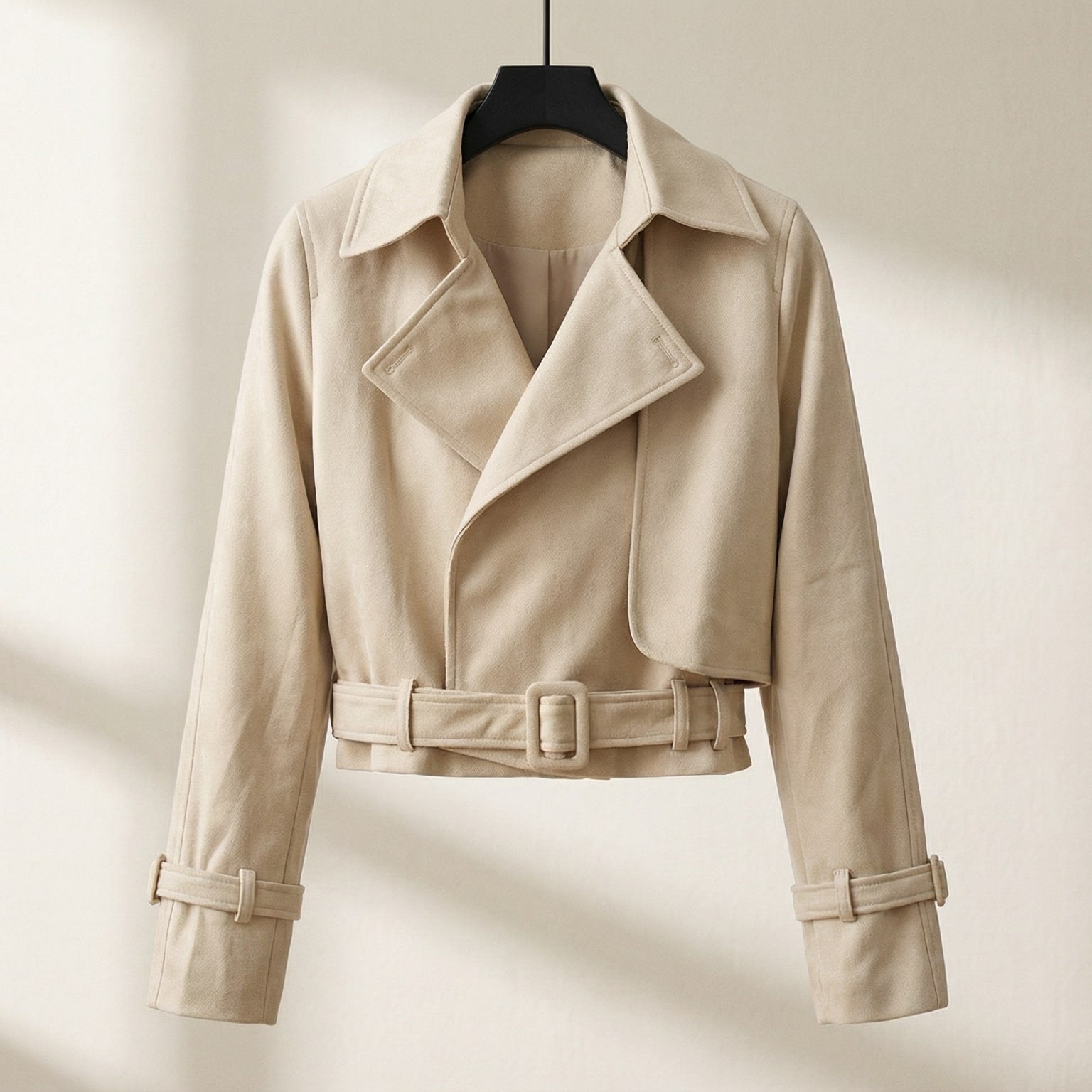 A cropped length paired with structured paneling and an integrated waist belt corrects proportion through the torso, creating a defined, confident outline when worn. A firm fabric build with wide lapels, reinforced seams, and controlled volume holds shape cleanly and prevents collapse throughout the day.