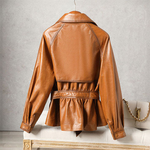 This double-breasted jacket is crafted from smooth leather with sharp lapels and a defined waist. The adjustable belt cinches to create shape, while deep pockets offer functionality without bulk.