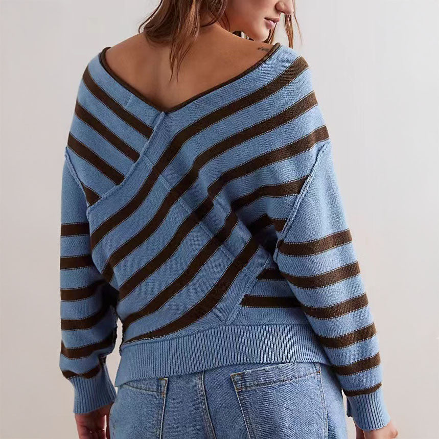 This sweater combines bold diagonal stripes with a relaxed off-shoulder neckline for a modern, effortless look. Crafted from soft knit fabric, it offers all-day comfort, while the ribbed hem and cuffs add a polished finish.
